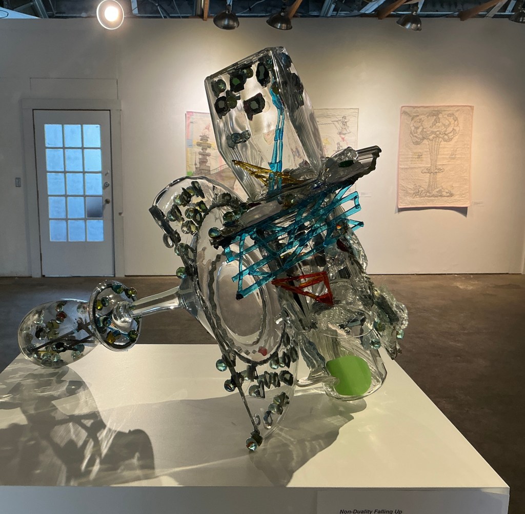 Non-Duality Inside Out, Outside In is an abstract composition of repurposed glass. The assemblage contains layers of forms which serve as a physical metaphor for non-duality. I was first introduced to the concept while listening to Ram Dass on YouTube . Later audio tapes by Alan Watts became another resource. This quote is printed on the label at the I Fell Gallery in Bloomington, Indiana is: