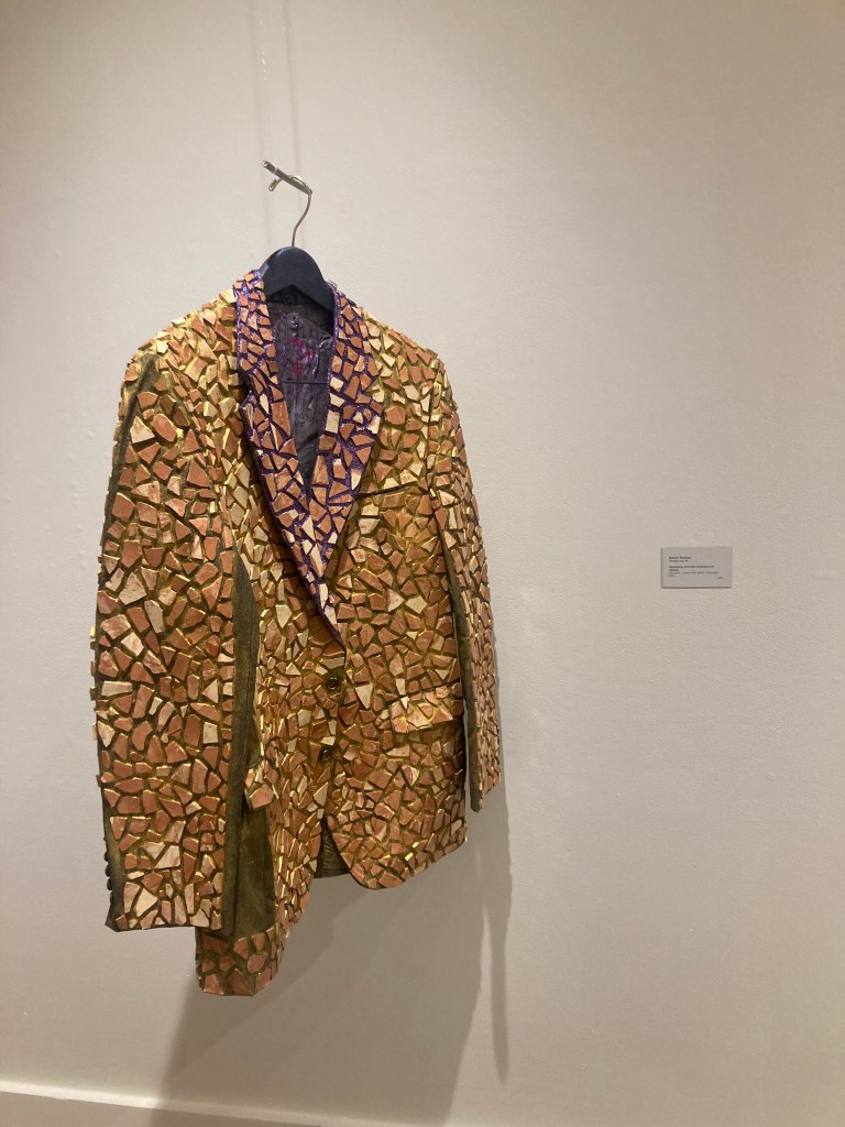 The mosaic tiles on this coat are terra cotta mixed with white earthenware. The photograph shows what it looks like in an exhibition in 2024 in the Indianapolis Art Center. The coat is heavy too.