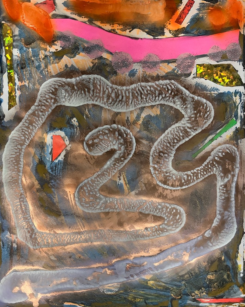 “Non-Duality Second Chakra” is about the same size as the other paintings on paper. Experimenting with a variety of materials is exciting to me. I like being able to control some elements while other components are the result of an independent process.