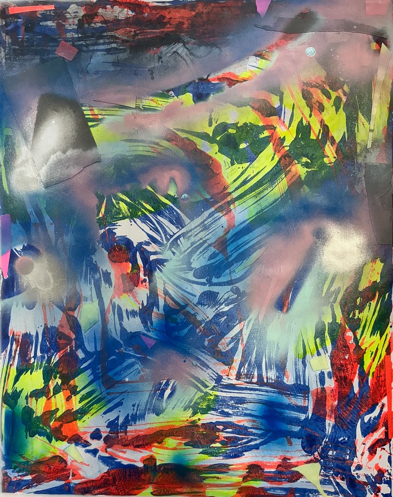 This paint on paper is entitled “Non-Duality Static Dance” from 2025. The dimensions are about 19” by 15”. I am investigating the layering of these forms using mix media.