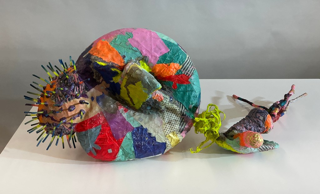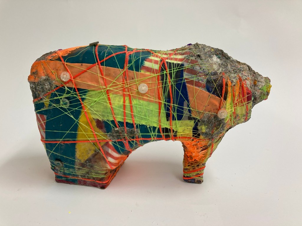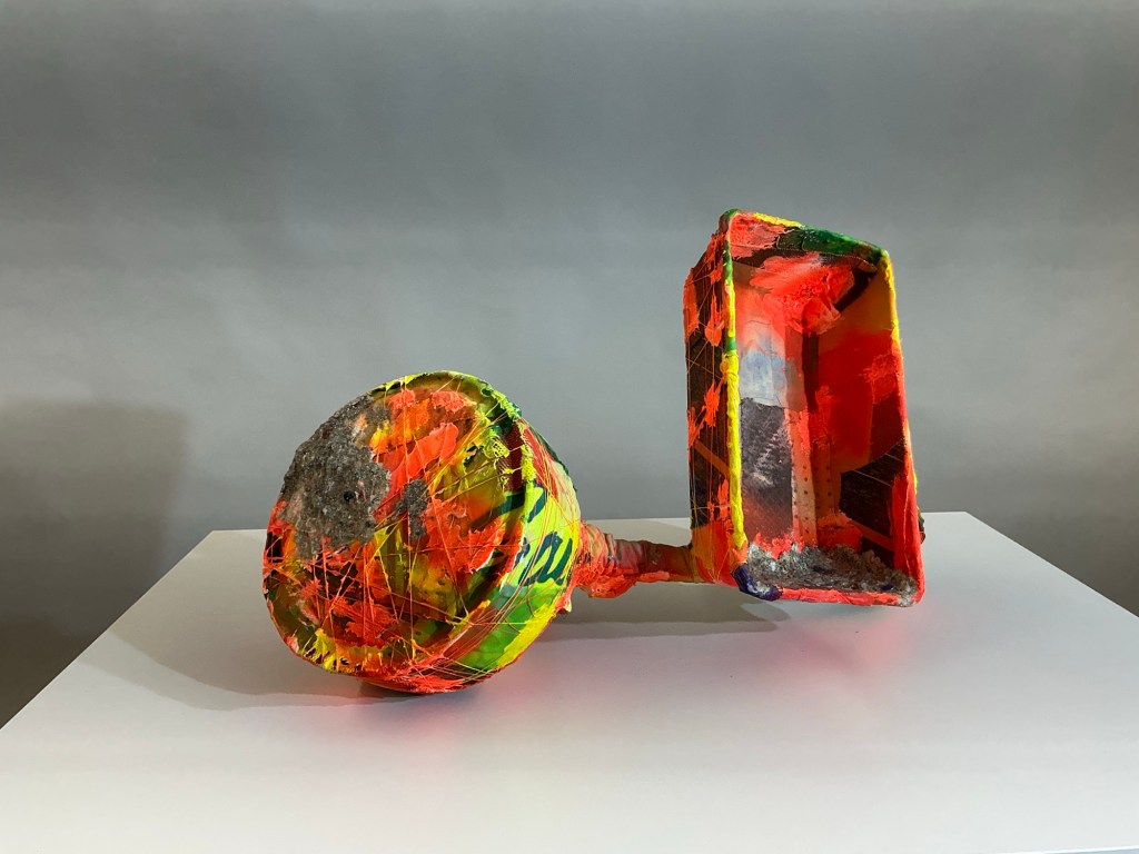 This assemblage is from 2020. The title is “Two Spirits, Moon”. The repurposed objects are covered in fabric and painted.